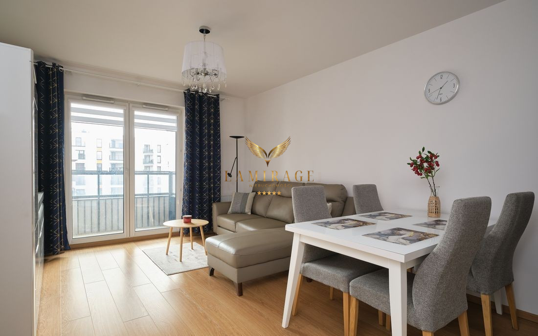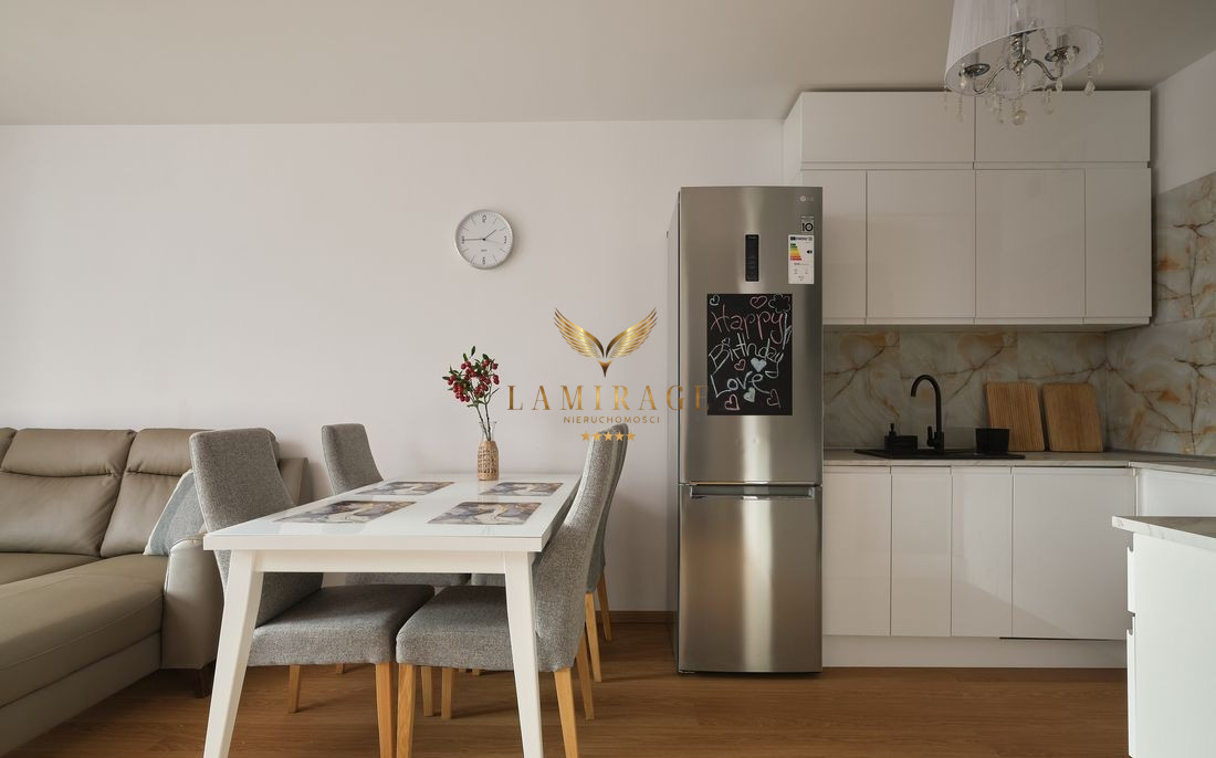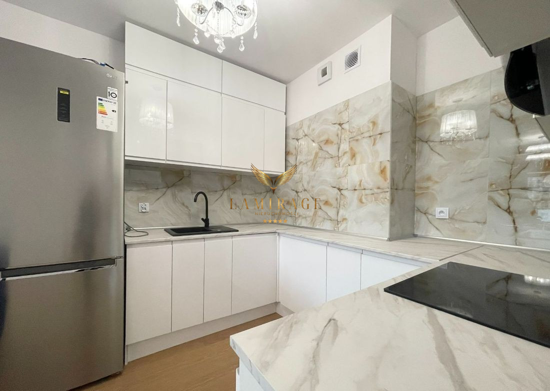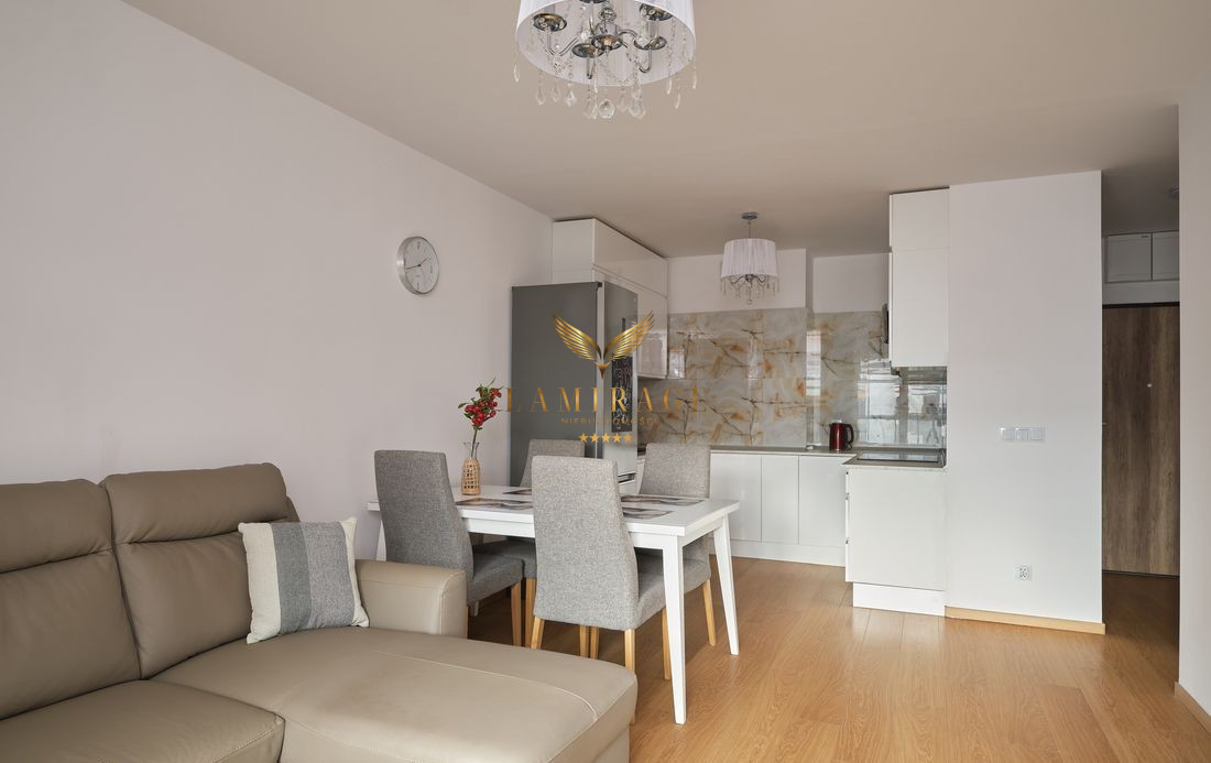 Mieszkanie jest w pełni umeblowane i wyposażone w nowe sprzęty: lodówka z zamrażarką, płyta elektryczna, piekarnik, okap, zmywarka, telewizor, pralka. W salonie zainstalowana jest również klimatyzacja.
