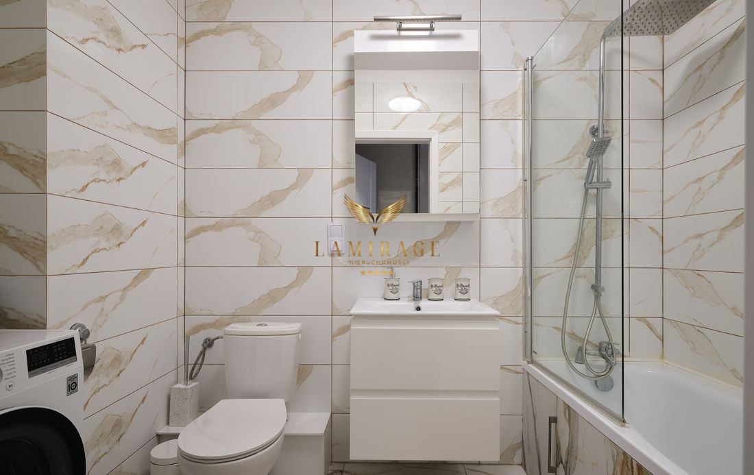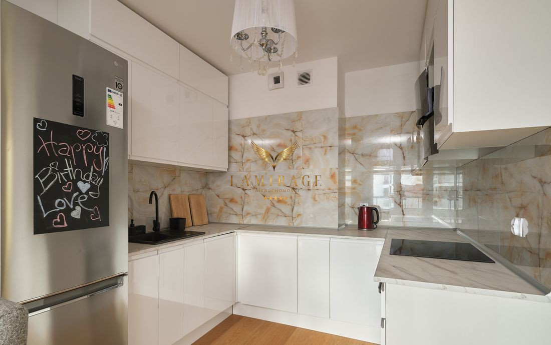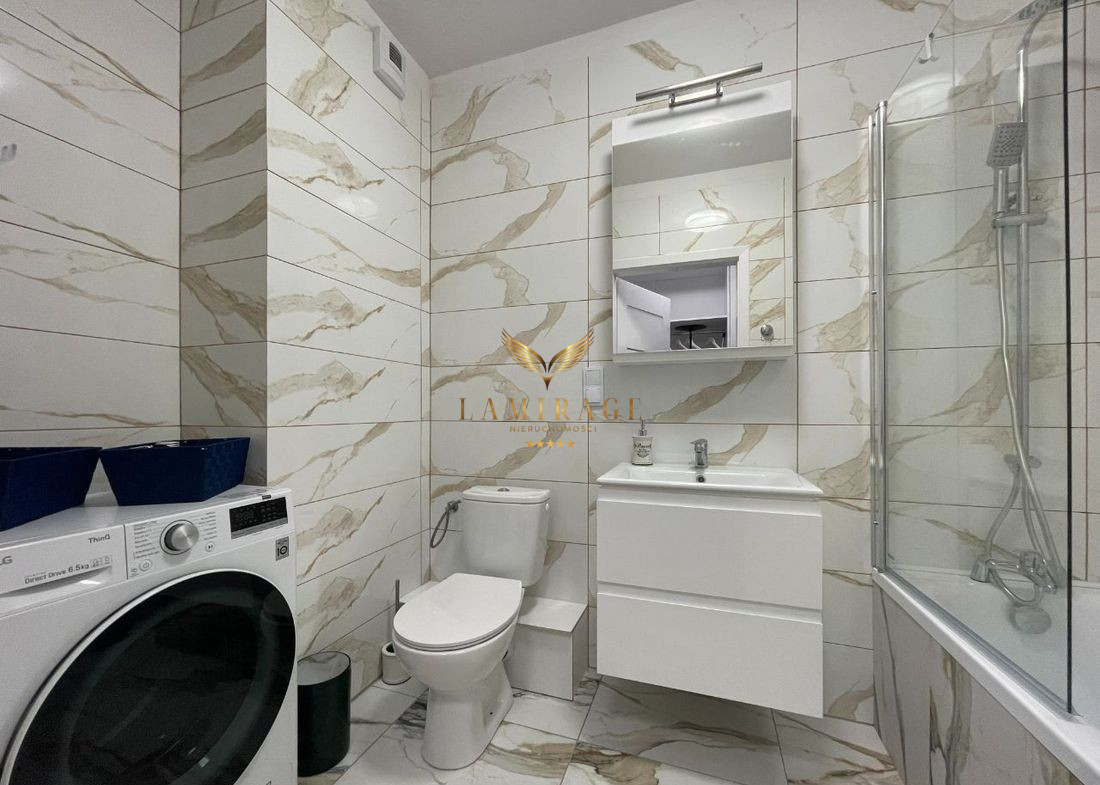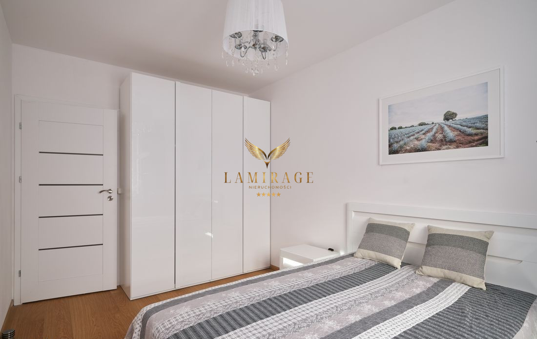 Mieszkanie jest w pełni umeblowane i wyposażone w nowe sprzęty: lodówka z zamrażarką, płyta elektryczna, piekarnik, okap, zmywarka, telewizor, pralka. W salonie zainstalowana jest również klimatyzacja.